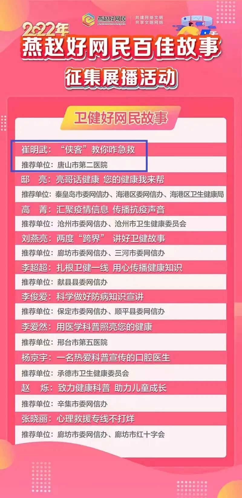 近日,由河北省委網(wǎng)信辦、河北省教育廳、河北省總工會等部門聯(lián)合舉辦的2022年燕趙好網(wǎng)民百佳故事征集展播活動結(jié)果正式揭曉,我院崔明武的“俠客”教你咋急救事跡成功入選2022年“燕趙好網(wǎng)民百佳故事”!